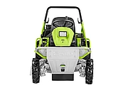 1-Messer-Mähdeck mit Heck- und Seitenauswurf. Parkbremse. Hydrostatischer Fahrantrieb regelbar über Handhebel, Komfort-Fahrersitz, Rammschutz vorne, Arbeitsscheinwerfer.