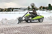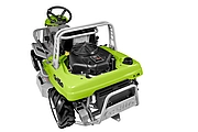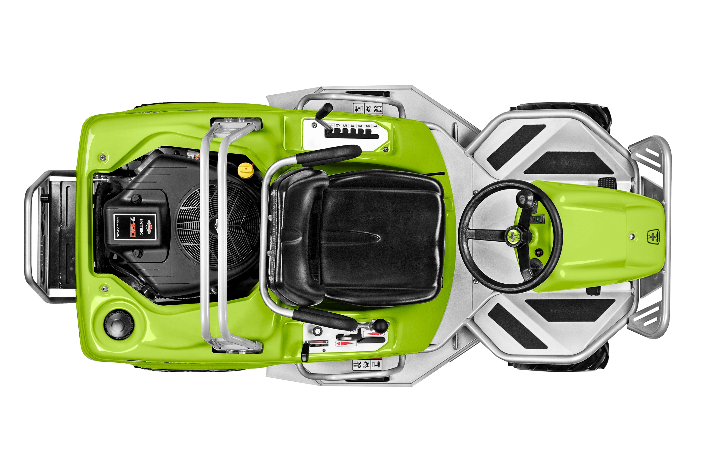 1-Messer-Mähdeck mit Heck- und Seitenauswurf. Parkbremse. Hydrostatischer Fahrantrieb regelbar über Handhebel, Komfort-Fahrersitz, Rammschutz vorne, Arbeitsscheinwerfer.