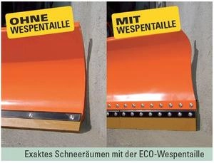 CAD-entwickelte Pflugform für geringsten Räum-Widerstand, Wespentaille für randnahes Räumen entlang von Wänden, Randsteinen und Hindernissen, Schürfleisten geschraubt, wahlweise aus Stahl oder Vulkolan-Hartgummi, stufenlos höhenverstellbare Gleitpilze, 2 groß dimensionierte Hydraulikzylinder für exakte Justierung, horizontaler Niveauausgleich für optimale Bodenanpassung, automatische Federrückstellung sorgt für eine gerade Pflugstellung auch im ausgehobenen Zustand (ideal für einfaches Befahren auf Gehwegen), Ausweichmechanismus mit Federklappensystem.