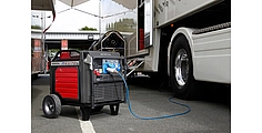 Äußerst manövrierfähig durch leicht zugängliche Griffe und stabile Räder. Großer Kraftstofftank, Auspuff mit Schalldämpfer-Technologie, Kraftstoffanzeige, Parallelbetrieb (bis 2 Geräte) möglich. 118,1 kg Eigengewicht, nur 91 dB(A) Schallleistungspegel, Betriebsdauer bei Dauerleistung: 6,5 h (12,3 h im Ökomodus), Ölmangelschutz, i-Monitor.