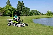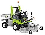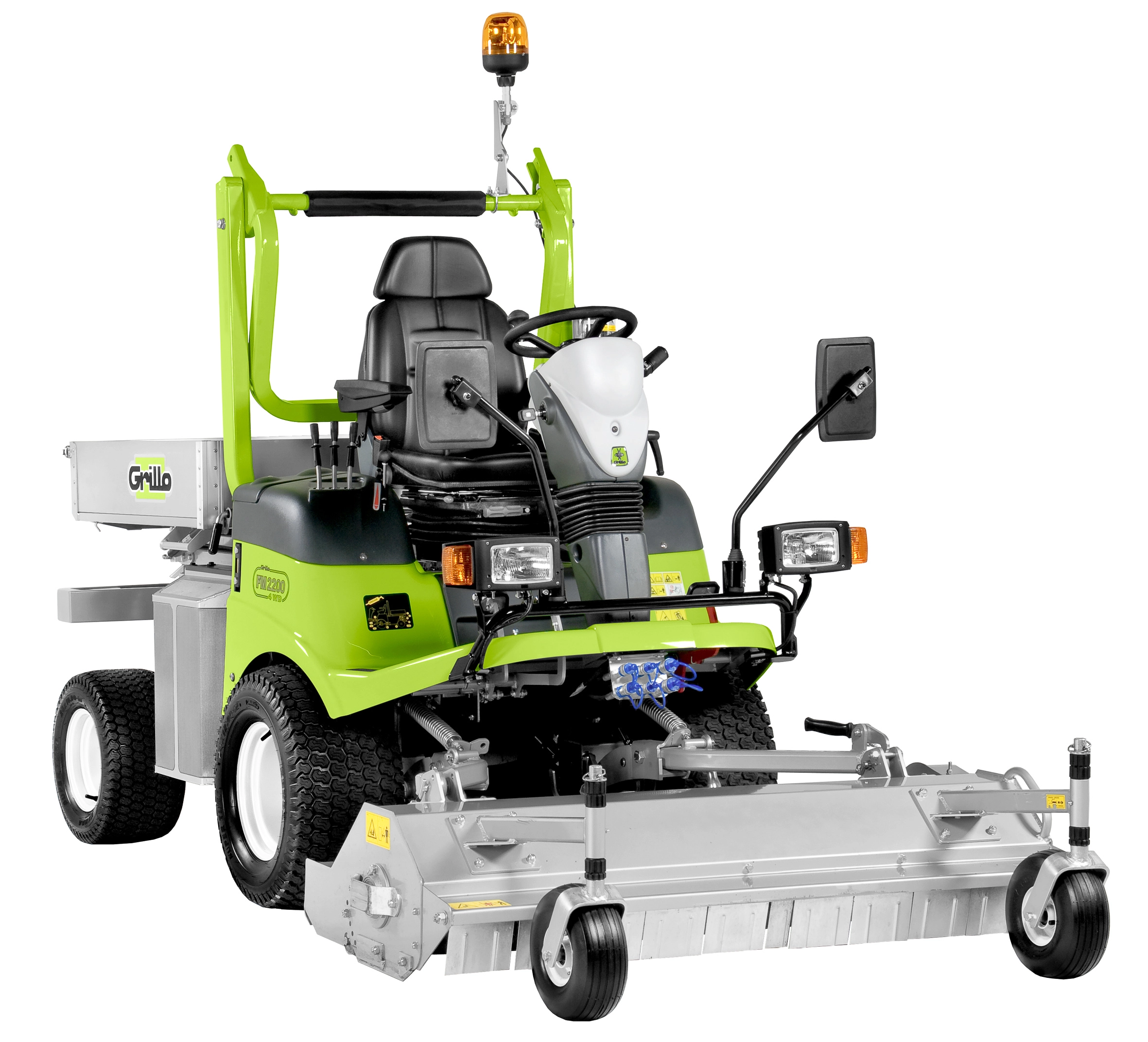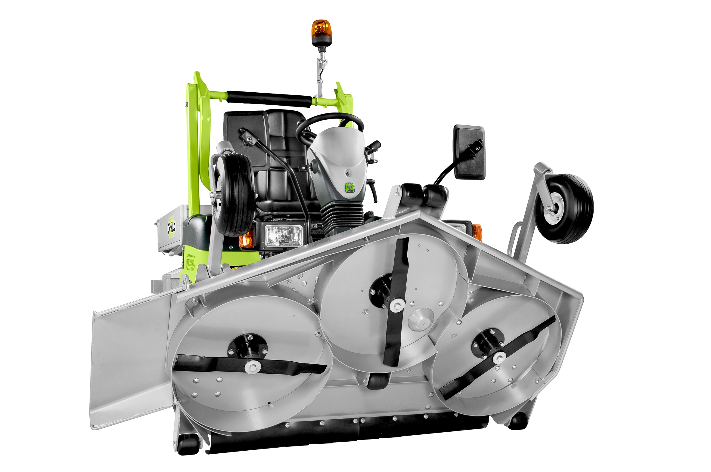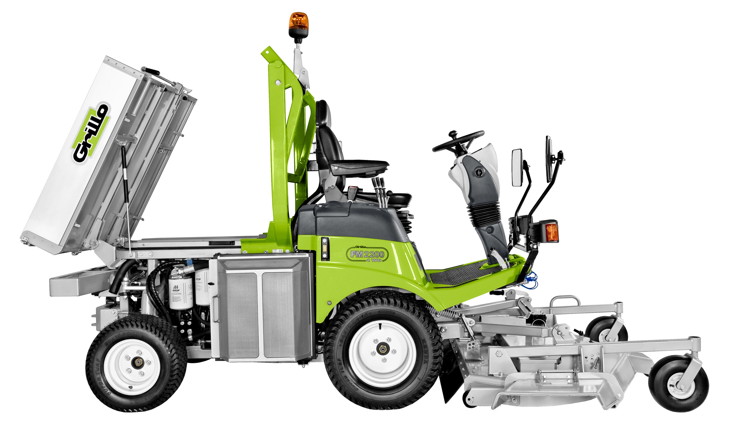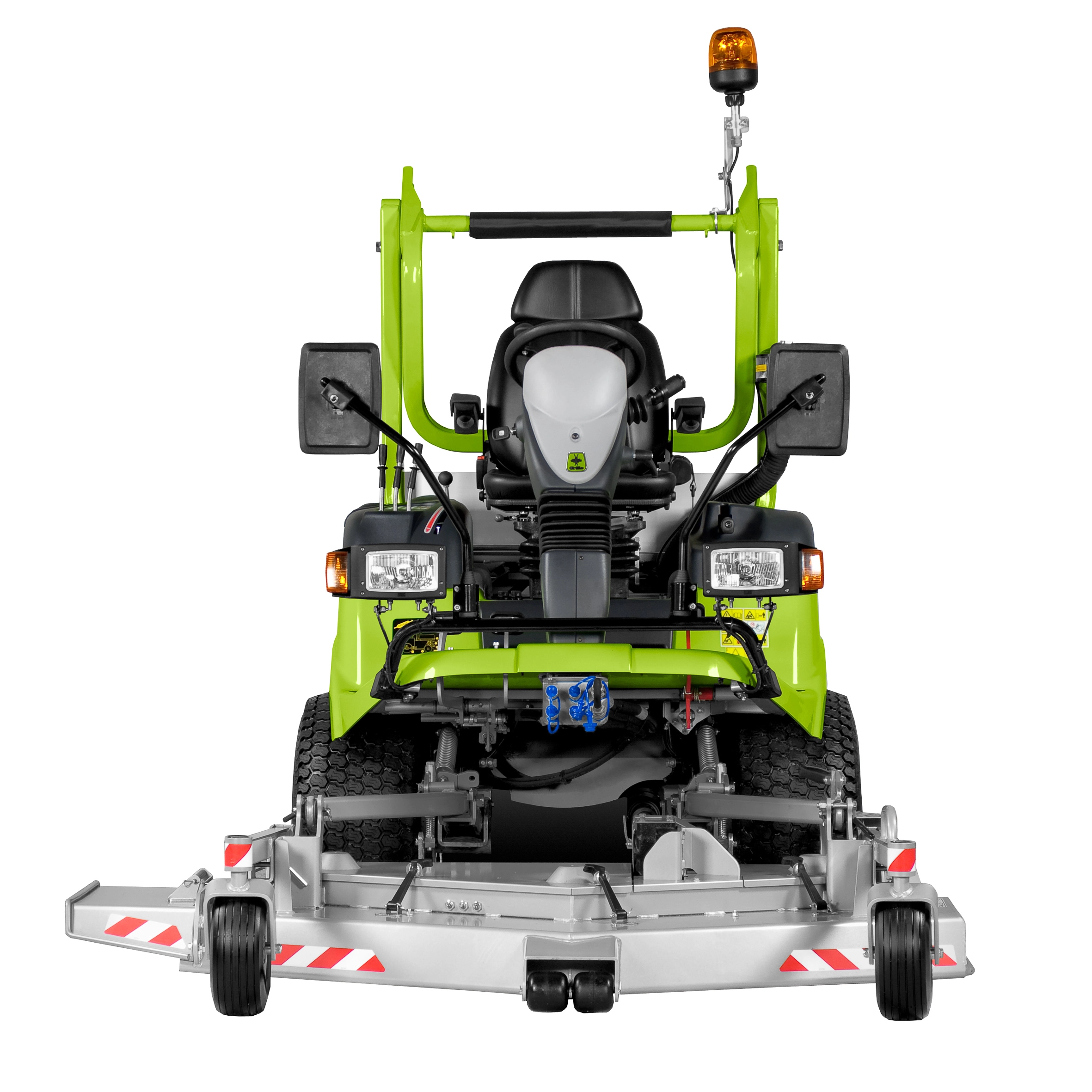 Hydraulische Mähwerksaushebung. Mähwerksantrieb ausschließlich über Kardanwelle und Winkelgetriebe - keine Keilriemen. 3-in-1 Funktion des Mähwerks: Mulchen, Heckauswurf, Seitenauswurf. Schnitthöhen-verstellung manuell über Steckbolzen am Mähwerk. Differentialsperre. Automatisch selbstreinigender Umkehrlüfter. Serienmäßig mit StVZO-Ausrüstung. Lenksäule neigungs- und höhenverstellbar. Komfort-Fahrersitz (auf Wunsch auch luftgefedert).