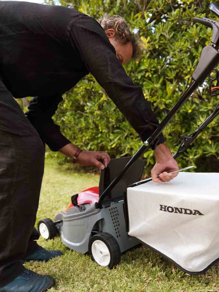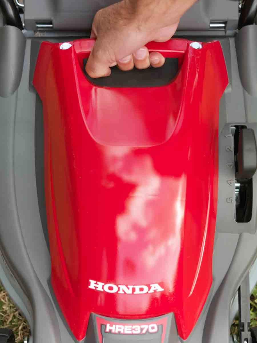 Einfachste Bedienung, ein stabiler, klappbarer Führungsholm, Motorzuschaltung direkt am Führungsholm zum bedienen, Optiflow-System für beste Grasaufnahme, Tragegriff