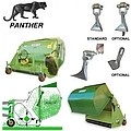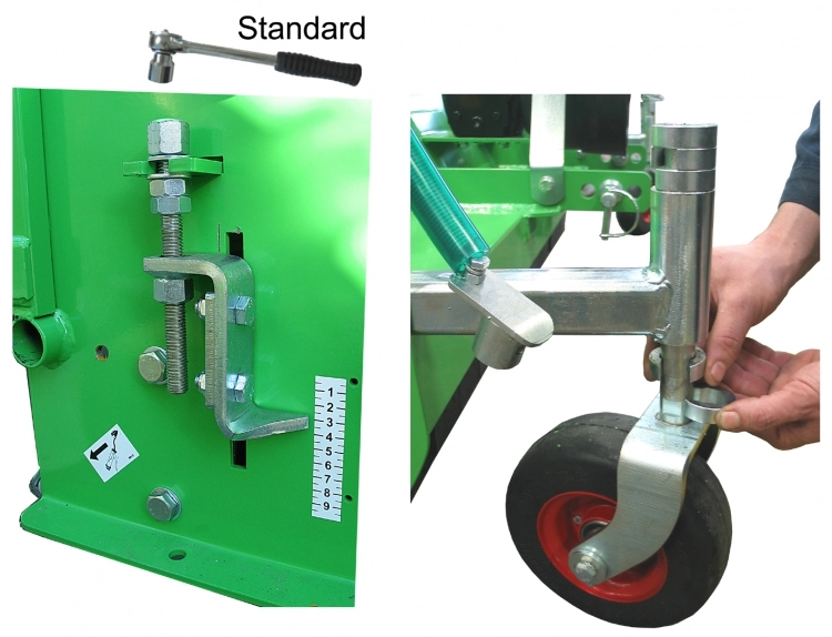 Mulch-Gegenschneide Serie. 2 robuste Front-Kaufräder, höhenverstellbar. Heckstützwalze über Spindeln stufenlos höhenverstellbar. Zahnkeilriemen mit automatischem Riemenspanner. Getriebe mit Freilauf. Optionale Ausstattung: Front-Bürsteneinheit zum Aufrichten des Mähguts, breite Front-Tasträder, luftbereifte Front-Tasträder, hydrl. höhenverstellbare Zugdeichsel mit hydrl. höhenverstellbaren seitl. Rädern für den gezogenen Einsatz bzw. Einsatz an Trägerfahrzeugen mit schwacher Heckhydraulik, Mulchklappe zum einfachen Umschalten der Einsatzweise. Einsetzbar im Extensivbereich mit schweren Gußmessern oder im gepflegten Rasenbereich mit Feinschnitt-Messern, auch in Kombination mit Vertikutiermessern.