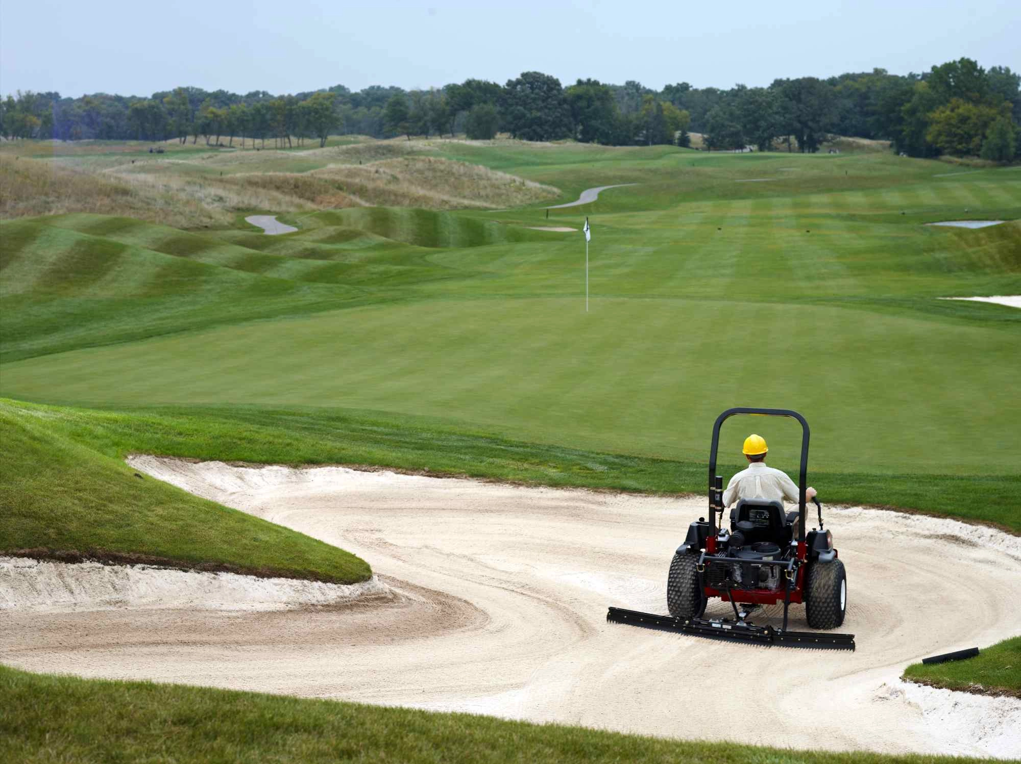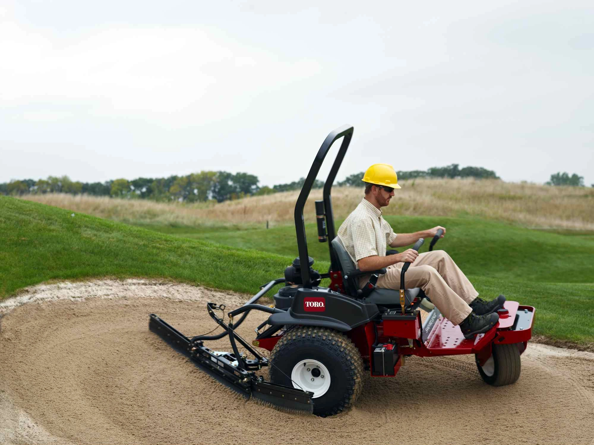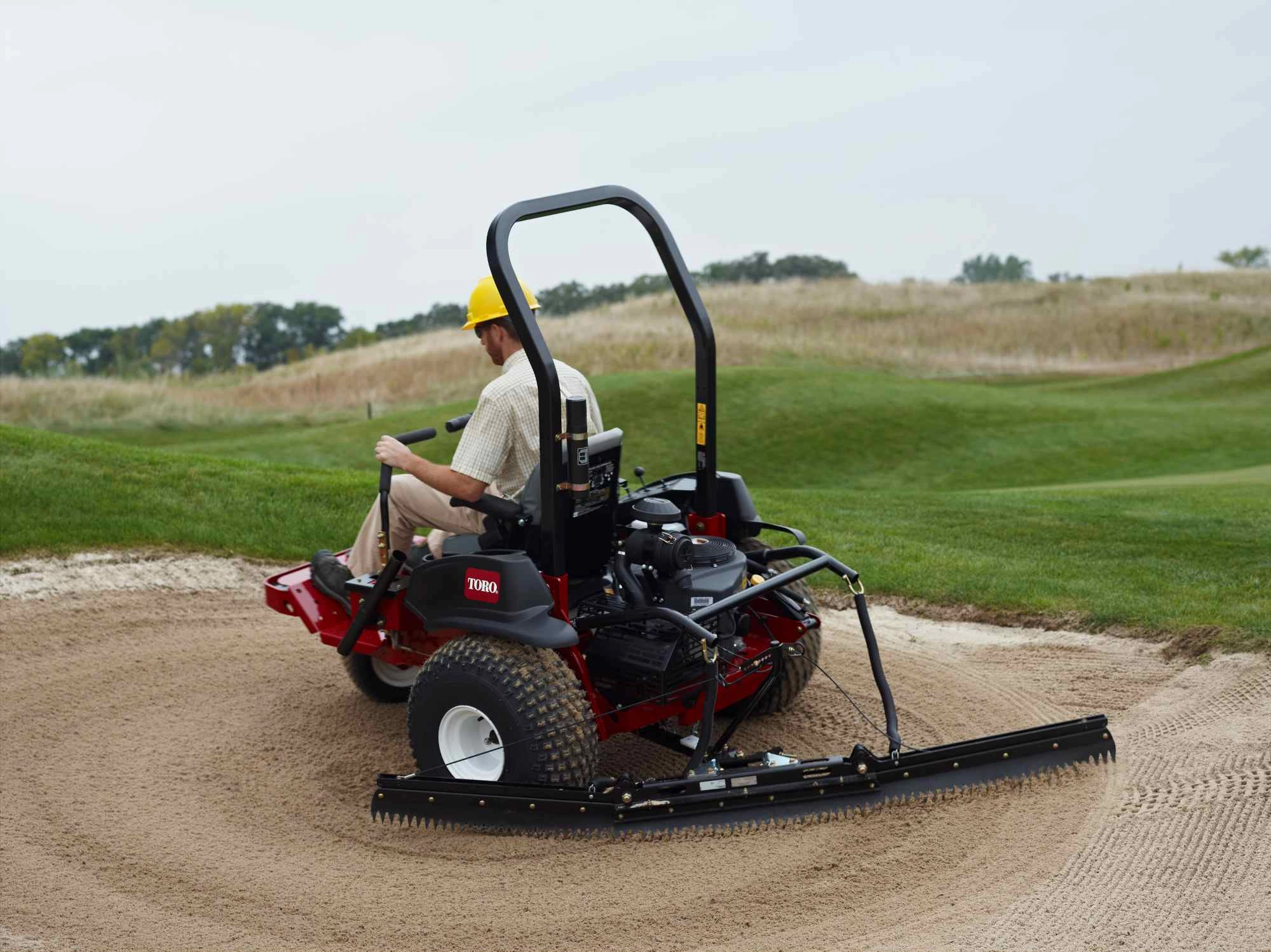 Mit diesem einzigartigen Bunkerrechen sparen Sie kostbare Arbeitszeit und Geld. Angebtrieben durch einen 2-Zylinder Kawasaki-Profi-Benzinmotor und hydrostatischem Antrieb. Der flexible, hydraulisch ausherbbare Zahnrechen verhindert Reifenspuren und Sandablagerungen. Erhinterlässt ein wunderbares Ergebnis und Spart dank seiner enormen Geschwindigkeit nahezu 50% Kraftstoff gegenüber herkömmlichen Bunkerrechen.
