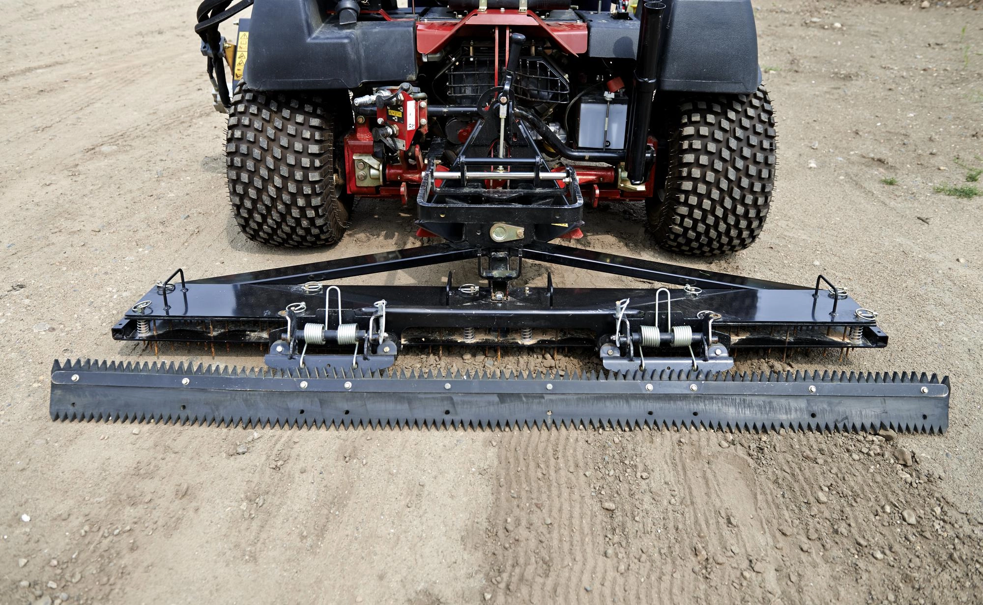 QAS Schnellwechseldreieck hinten, Manuelles Frontschild 102 cm, Schildverbreiterung auf 152 cm, Zahnrechen, Schleppmatte, mehrteiliger Besen, Besen für Zahnrechen, Rasenbesen, drehnede Glättscheiben, Federrechen, Nagelrechen, Synthetisches Rasenpflegegerät, QAS-Finish-Grader, QAS-Rasenlüfter, QAS-Laubbläser, Rahn-Groomer, profillose Reifen, Rasenreifen, Bunkerpumpe, Erweiterungsschlauchpaket für Pumpe, Lippenbesen