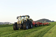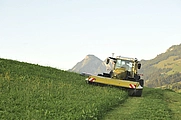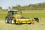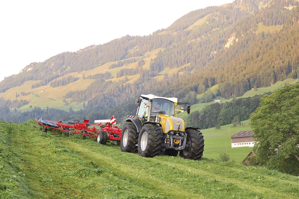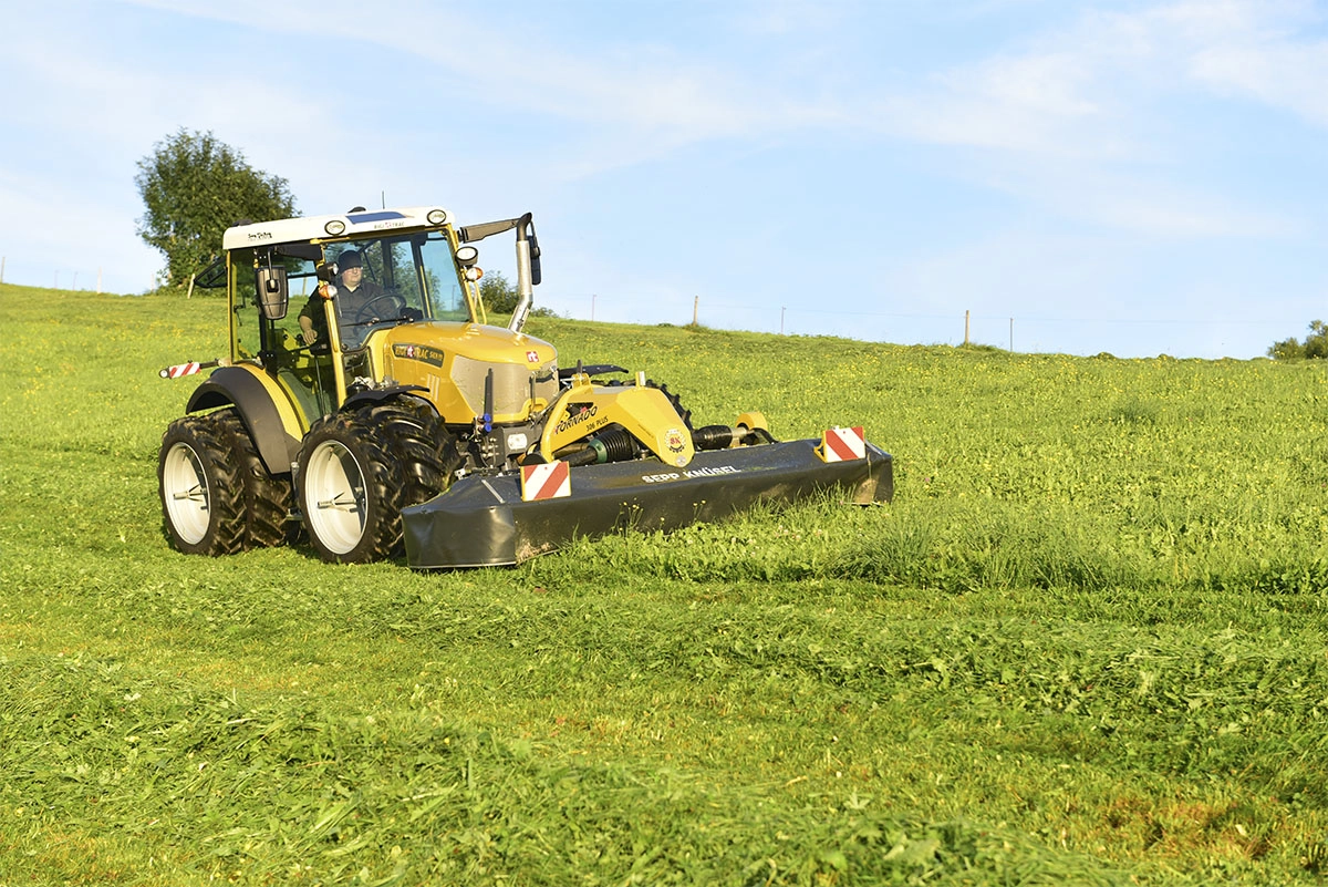 Stufenloser Antrieb, Chassisbaurahmen mit zentralem Drehgelenk bis 22° verdrehbar, 35% bessere Hangtauglichkeit und Standfestigkeit als ein Standardtraktor, hochkomfortable Fahrerkabine, integriert, schallisoliert, geprüft – für den Anwender mit dem gewissen Extra-Anspruch!