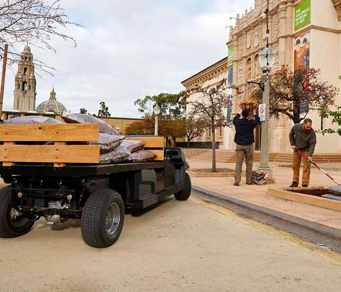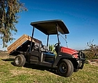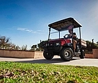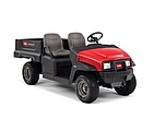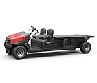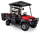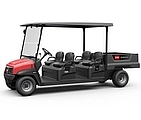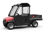 verlängerter Radstand für 2-Sitzer mit großer, 1,8m Ladefläche, Ablagefach unter Motorhaube, Befestigung für Abfalleimer, elektrische Aushebung der Ladepritsche, Rammschutz, 12-V-Steckdose, Deluxe-Komplettkabine, Rückwärtsfahr-Signal, Feststellbremsen-Signal, Geländereifen, komplette StVZO-Ausrüstung, Gitter auf Pritschenbordwänden
