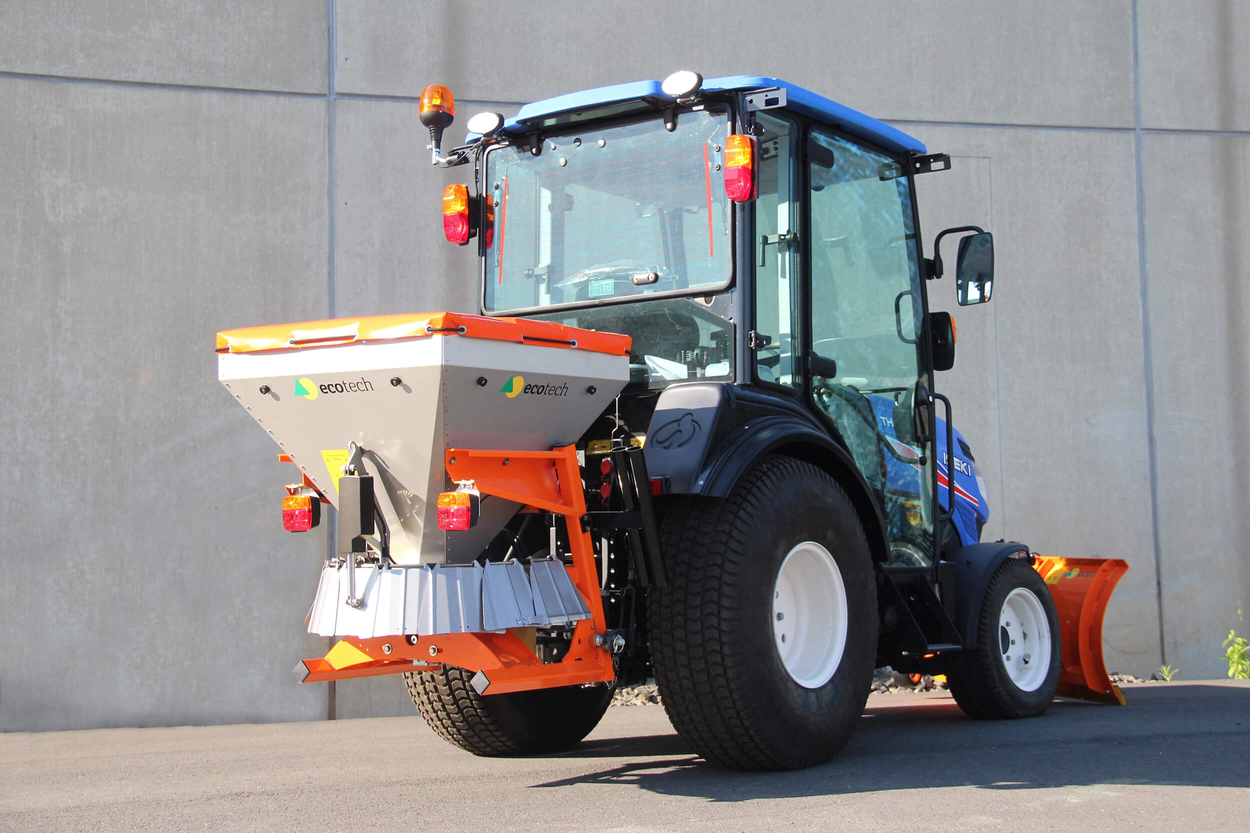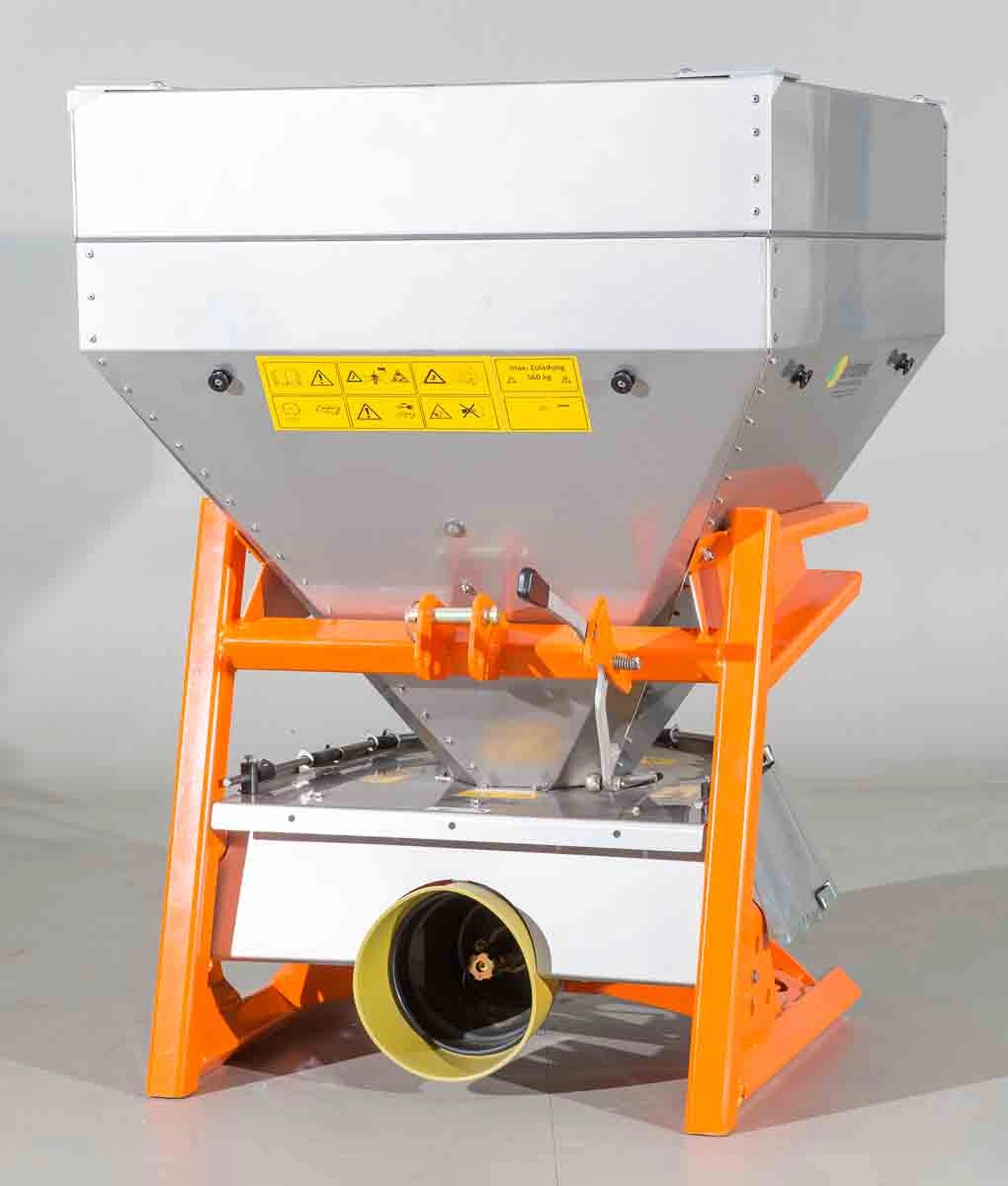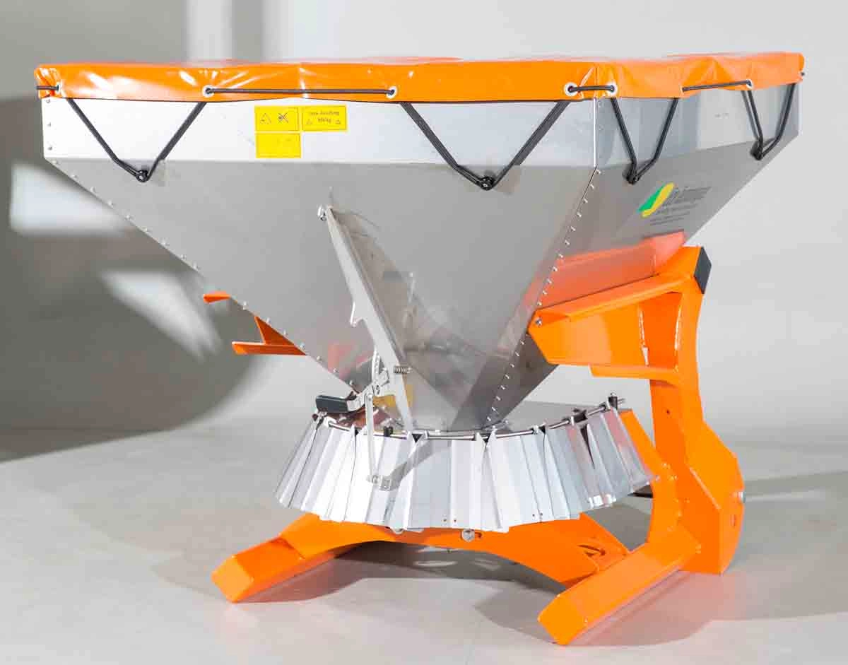 Behälter aus Edelstahl (achteckig), Rahmen und Schutzgitter lackiert, Streuteller mit Wurfflügeln und Streubegrenzer komplett aus Edelstahl. Antrieb über Zapfwelle oder mit Hydro-Motor. Rührwelle mit praktischem Bajonettverschluss zum einfachen Austausch der Rührwerke. Splitt-/Granulat- oder Salz-/Sand-Rührwerk wahlweise. Manuelle Streumengenverstellung, großer Gelenkwellen-Schutzkopf am Getriebe, manuelle Streubreitenverstellung, schlepperseitiges Streuschutzblech aus Edelstahl.
